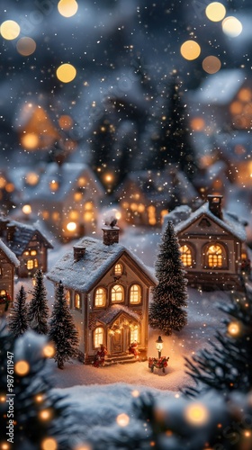 Fototapeta premium Cozy Christmas village with warm glowing lights and snowy rooftops