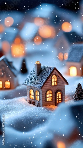 Fototapeta premium Cozy Christmas village with warm glowing lights and snowy rooftops