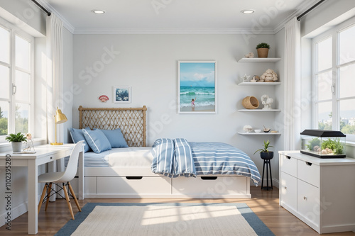 © Derek Brumby, Fototapeta premium Cozy Coastal-Themed Bedroom with Natural Light and Modern Decor