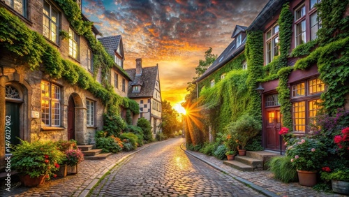 Fototapeta premium Cozy cobblestone street with historic buildings and lush greenery at sunset ,...