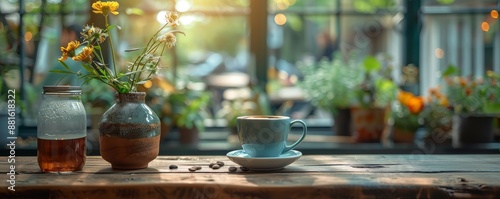 Fototapeta premium Cozy Coffee Shop Table with Flowers, Coffee Cup, and Jar in Sunlit Atmosphere