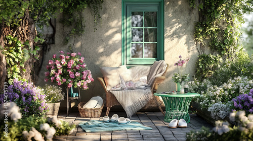 © Sahraya, Obraz premium Cozy composition of warm terrace interior with garden armchair, pillows, vase with flowers, bench, green coffee table, slippers, vase with flowers and personal accessories. Home decor. Template.