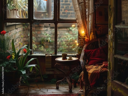 Obraz premium Cozy corner with a cup of tea and plants in a warm, sunlit room during a...