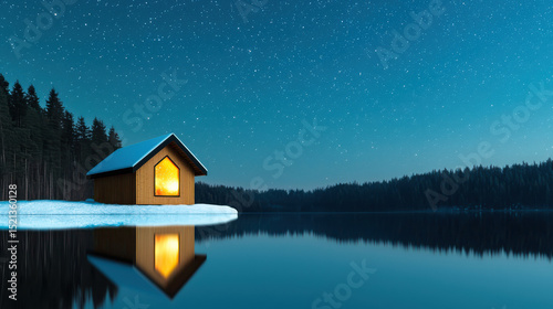 © Dream Vision, Fototapeta premium Cozy cottage glowing warmly by snowy lake under starry night sky