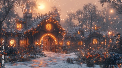 Obraz premium Cozy cottage glows with warm lights, nestled in a snowy, dreamy winter...