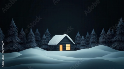 Fototapeta premium Cozy cottage in a snowy forest, silent winter night, warm light from windows,...