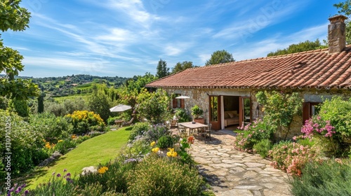 © CC, Fototapeta premium Cozy countryside villa with red roof and lush garden in summer