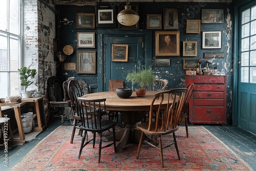 Naklejka premium Cozy dining area with a rustic table and vintage decor.