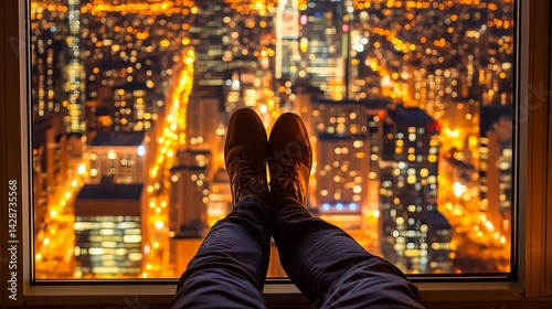 © STDG, Obraz premium Cozy Evening View of City Lights from Open Window with Relaxed Feet