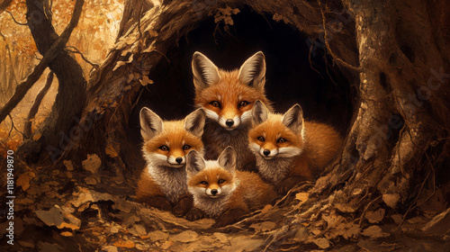 Fototapeta premium Cozy family of foxes in their den, nestled in warm forest burrow, surrounded...