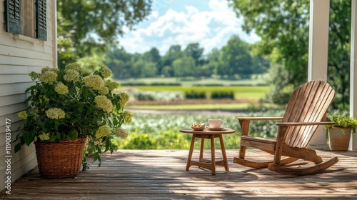 © Alexey, Obraz premium Cozy Farmhouse Veranda. Generative AI