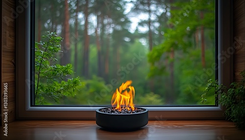 © tahu, Naklejka premium Cozy fire pit by window, forest view