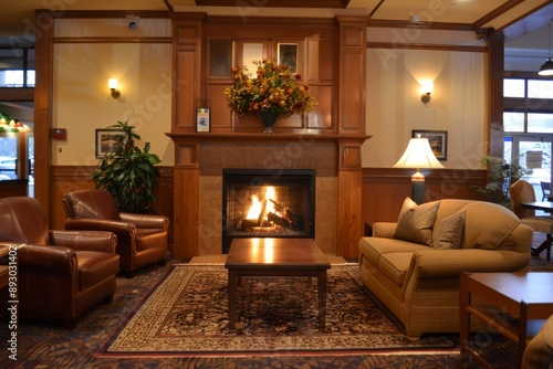 © Amni, Naklejka premium Cozy Fireplace Lounge in a Warmly Decorated Lobby