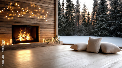 Obraz premium Cozy fireplace wooden cabin winter pillows