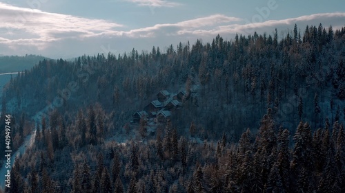 Obraz premium Cozy forest houses hidden in the forest in the mountains