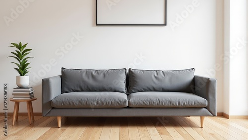 Fototapeta premium Cozy gray couch adorned with plush pillows rests on sleek horizontal wooden...