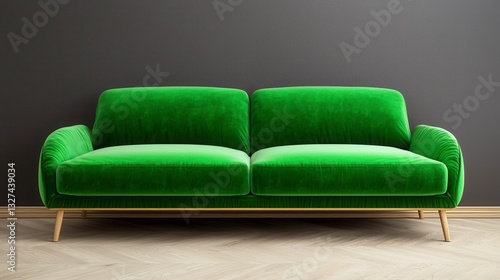 © Suppattra, Fototapeta premium Cozy green couch positioned against a subtle grey wall in a modern home interior living space design scene