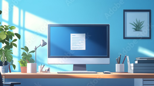 © Di, Fototapeta premium Cozy Green Office Concept Showcasing Minimalist Style: A work Desk with computer, Documents, green plants and Well-Lit Interior. graphic Resources, Illustration,