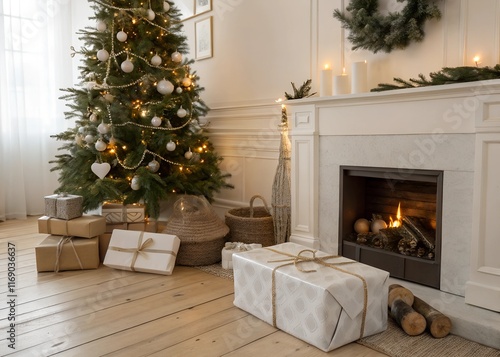 Fototapeta premium Cozy Holiday Living Room with Christmas Tree and Gifts