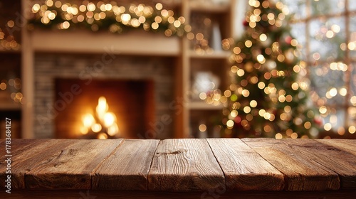 © Oleksandr, Fototapeta premium Cozy holiday scene featuring a rustic wooden table, with a warmly lit fireplace and a decorated tree in the background, creating a festive and inviting atmosphere.
