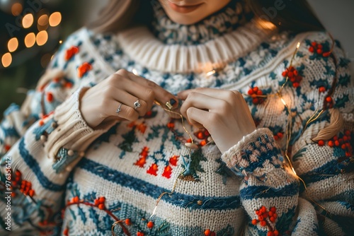 © Valentin, Fototapeta premium Cozy Holiday Vibes: A Close-Up of a Festive Sweater with Decorative Details