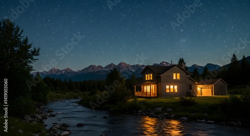 Fototapeta premium Cozy home by river under starry sky, peaceful mountain getaway at night
