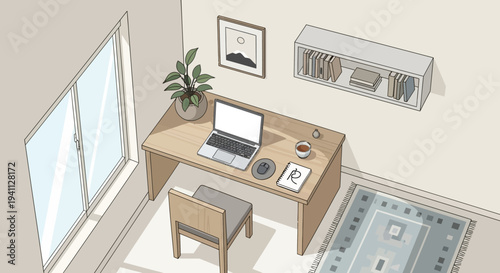 © helmi, Naklejka premium Cozy Home Office Setup with Laptop, Coffee, and Plant - Minimalist Workspace