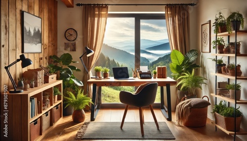 © ProStockGallery, Fototapeta premium Cozy Home Office with Mountain View and Rustic Decor.