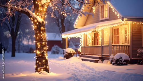 Fototapeta premium Cozy house adorned with warm white Christmas lights creates festive winter scene in snow