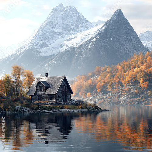 Fototapeta premium Cozy house overlooking water with mountain landscape photos