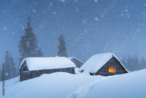 © Ivan Kmit, Fototapeta premium Cozy house with warm light during winter snowfall in a snowy forest. Cold mountain night landscape with snow covered trees