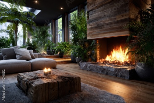 © YouraPechkin, Fototapeta premium Cozy indoor living area with fireplace and abundant greenery in natural light