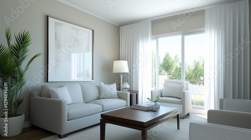 Fototapeta premium Cozy Interior: A light-filled living room showcasing a modern sofa, elegant...