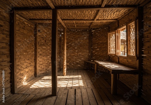 © Kathy, Obraz premium Cozy interior of a rustic, handmade beach hut, showcasing woven walls, natural textures, and filtered sunlight ,structure ,light ,seaside