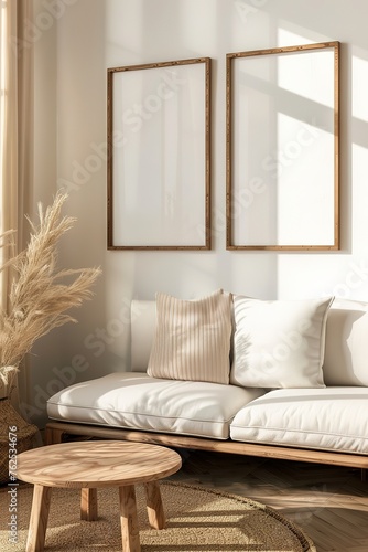 Fototapeta premium Cozy interior with sunlight casting shadows on a comfortable sofa and blank picture frames.