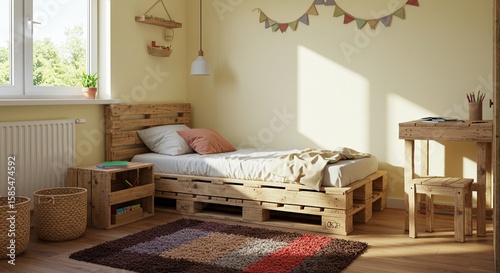 © arsha, Obraz premium Cozy Kid's Bedroom with DIY Pallet Bed and Natural Sunlight