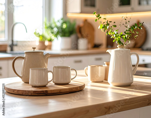 © Saktanong, Obraz premium Cozy Kitchen Countertop Close-Up with Neutral Decor