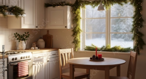 Fototapeta premium Cozy kitchen decorated for Holidays with Christmas garland and string light, showcasing a festive and warm home interior during winter.