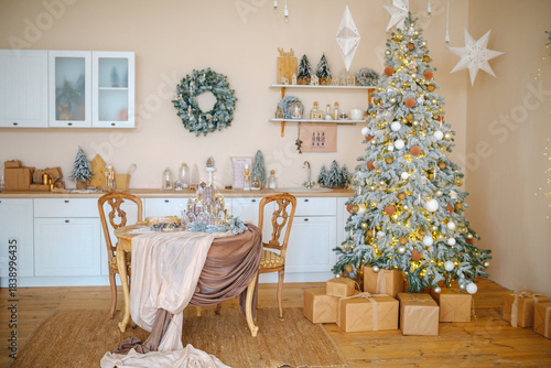 Obraz premium Cozy kitchen decorated for winter holidays with a lit Christmas tree and...
