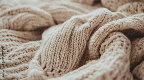 Fototapeta premium Cozy knit fabric texture in soft beige tones, perfect for warmth and comfort. This captures intricate patterns and inviting feel of knitted textiles