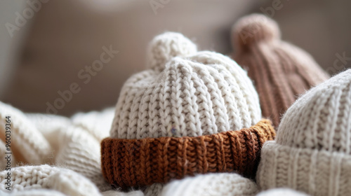 © Julia Jones, Obraz premium Cozy Knitted Winter Hats Display on a Comfortable Couch