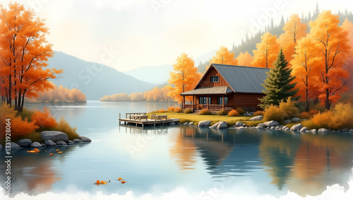 © Netaya, Fototapeta premium Cozy Lakeside Cabin in Vibrant Fall Foliage: Autumn Watercolor Art