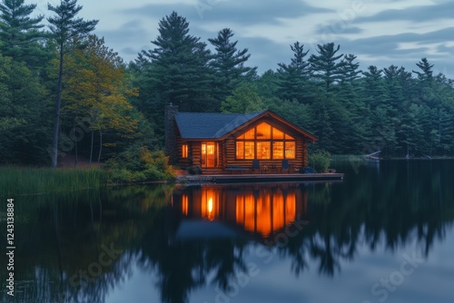 Obraz premium Cozy lakeside cabin surrounded by pine trees