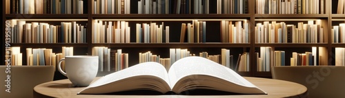 Fototapeta premium Cozy Library Setting with Open Book and Coffee Cup in a Warm Atmosphere