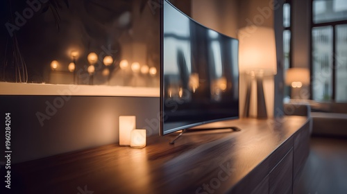 © Jojo*, Fototapeta premium Cozy Living Room Ambiance with Modern TV and Warm Lighting.