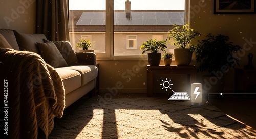 © Bintang, Obraz premium Cozy living room bathed in sunlight with plants and sofa.