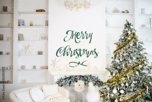 Fototapeta premium Cozy living room decorated for Christmas with a lit tree and fireplace