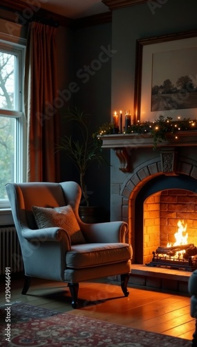 Fototapeta premium Cozy living room fireplace armchair, warm light, relaxation, home, warmth