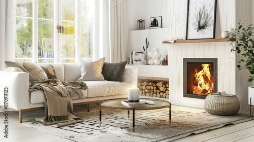 © ASA Creative, Fototapeta premium cozy living room interior scandinavian style, modern, minimalistic, fireplace, wooden table, couch