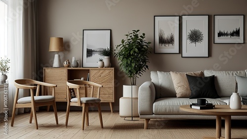 Fototapeta premium Cozy living room interior, Scandinavian style. Wooden furniture and elegant.